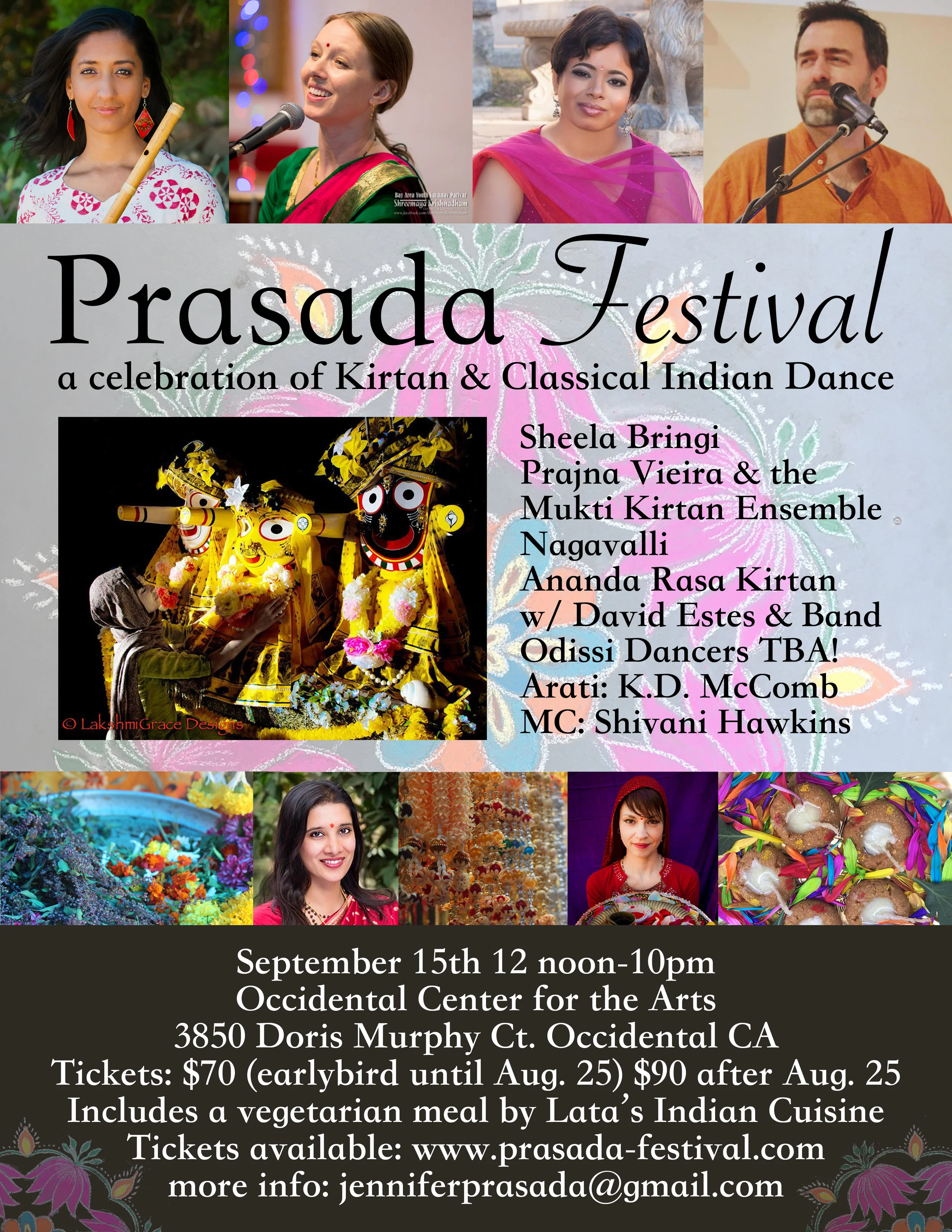 Prasada Festival is a daylong celebration of kirtan and classical Indian dance in the beautiful small town of Occidental, CA (about 90 min. north of San Francisco).